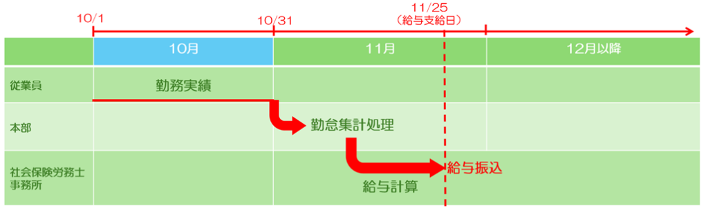 【給与計算スケジュール例(11月度給与;支給日11月25日)】                                           ①10月1日~末日:対象月                                                         ②11月上旬~中旬:当月勤怠の締め・集計処理                                                 ③11月中旬~下旬:上記②に基づく給与計算処理                                          ④11月25日:給与振込み