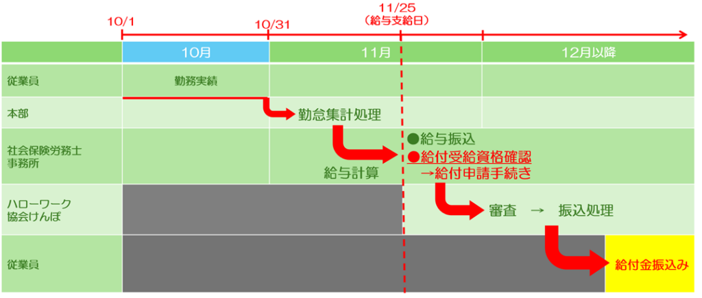 【給与計算スケジュール例(11月度給与;支給日11月25日)】                                    ①10月1日~末日:勤務月                                                           ②11月上旬:前月勤怠の締め・集計処理                                                ③11月中旬~下旬:上記②に基づく給与計算処理                              ④11月25日:給与振込み                                                        ⑤11月25日以降:受給資格のある期間に対する給付申請手続きを開始                                  ⑥12月上旬~中旬:申請先(協会けんぽ・ハローワーク)での審査⑦12月下旬以降:給付処理(申請から2~3週間程度を目安)